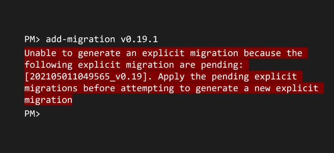 What happened ? I was trying to do an entity migration using Package Manager console in Visual Studio for my newly edited entities. But while I was executing 'update-database' command with '-verbose' flag, it throwed an error and update had failed. After I fix the error in the entity, I was trying to run 'add-migration' … Continue reading EntityFramework 6 : Unable to generate an explicit migration because the following explicit migration are pending: