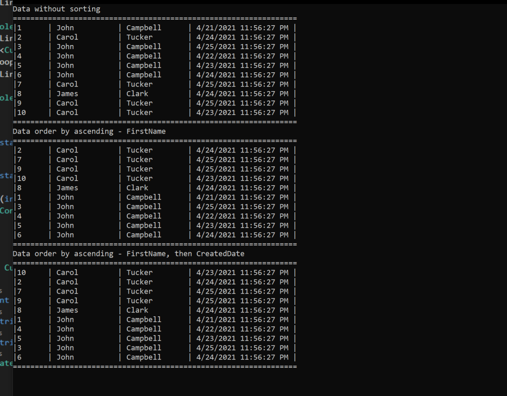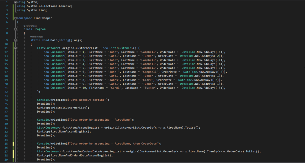 Assume that you have a list of customer objects which you want to order by the first name and then item order date. How are you going to do that with LINQ? Is there any easy method in Linq?